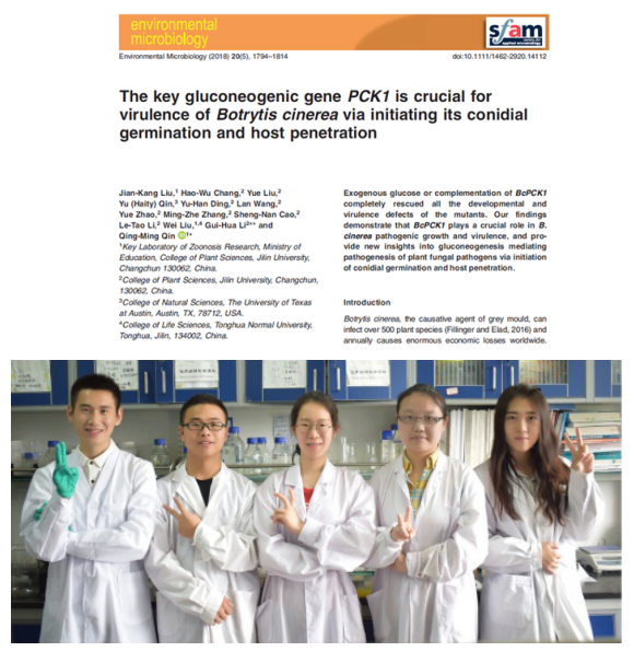 On April 24, 2018, the internationally renowned academic journal "Environmental Microbiology" (Chinese Academy of Sciences JCR zone: Environmental Science and Ecology Zone 1, 5 years IF: 5.965) published online in the journal of Professor Qin Qingming's research group from the School of Plant Science, Jilin University. "The key gluconeogenic gene PCK1 is crucial for virulence of Botrytis cinerea via initiating its conidial germination and host penetration" research paper. It is worth mentioning that the research was completed by an undergraduate innovation research team composed of undergraduates under the guidance of Professor Qingming Qin.