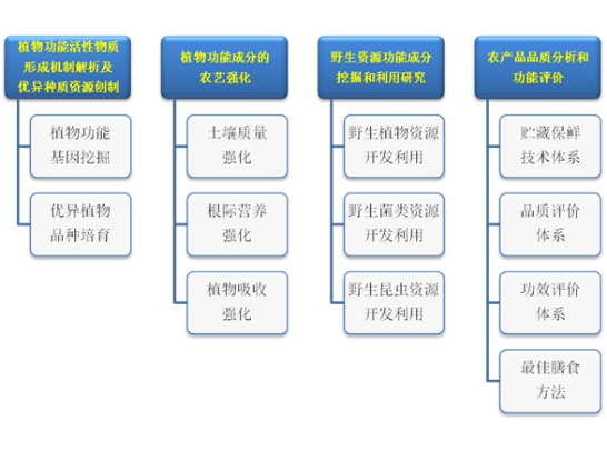 功能农业作为农业未来发展的新阶段,支撑着农业的生态高值目标,也开启了“吃”的新时代,高产农业解决了人们“吃得饱”的问题,绿色农业解决了人们“吃得安全”的问题,而功能农业主要是希望解决人们“吃得健康”的问题。功能农业工程研究中心瞄准未来大健康、农业科技前沿及吉林省农业供给侧结构性改革的现实需求,从植物功能性成分的资源挖掘,功能性成分的育种强化、农艺强化技术入手,结合产品的品质分析和功能性评价的研究,为进一步提升我省农业发展质量,推进乡村绿色发展,实现新时代农业的“弯道超车”提供技术储备和理论支撑。本研究中心主任为吴刚教授。研究重点主要侧重于以下几方面:1)植物功能活性物质形成机制解析及优异种质资源创制。2)植物功能成分的农艺强化。3)野生资源功能成分挖掘和利用研究。4)农产品品质分析和功能评价研究。具体主要发展方向及任务如下: