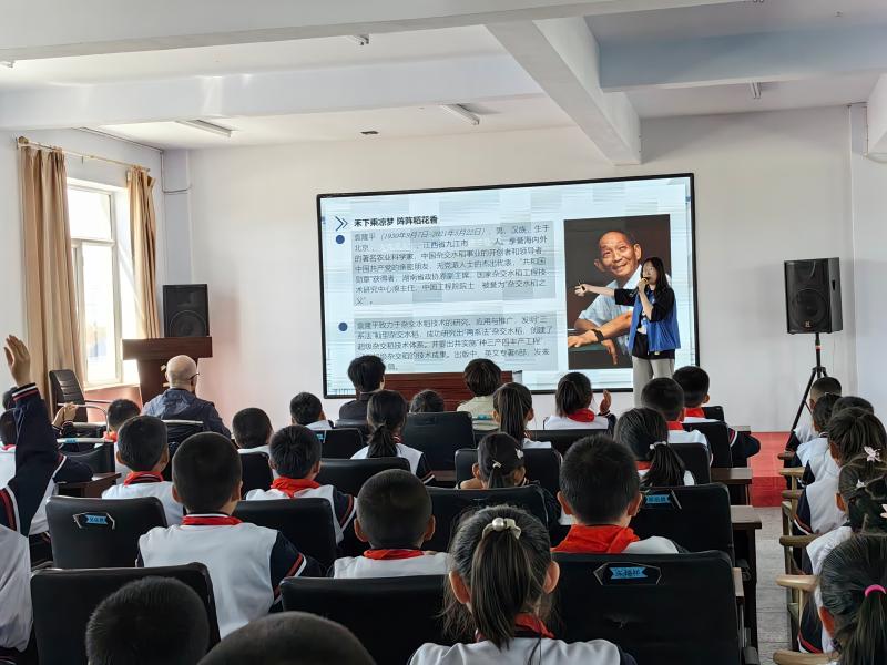为弘扬学习习近平总书记给中国农业大学科技小院的同学们的回信精神,引导青少年学习袁隆平院士高贵品质和崇高风范,以实干实效继承袁隆平院士的遗志,5月22日,在袁隆平院士逝世两周年之际,bat365在线中国官网登录入口实践团联合我校港澳台学生前往珲春市哈达门乡中心学校开展宣讲活动,向学校学生宣讲袁隆平院士事迹、开展我国农耕文明知识讲座。