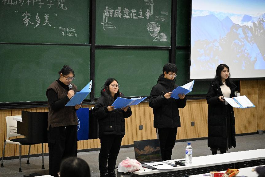 在激烈的团队战之后,志工部工作人员们为大家带来了精彩的“说家乡”朗诵。在湖光山色的名胜、精彩纷呈的人文的背景视频铺陈中,那一句句饱含深情的赞颂,无不唤起了大家对家乡的自豪与思念,同时,也收获了同学们由衷的掌声。