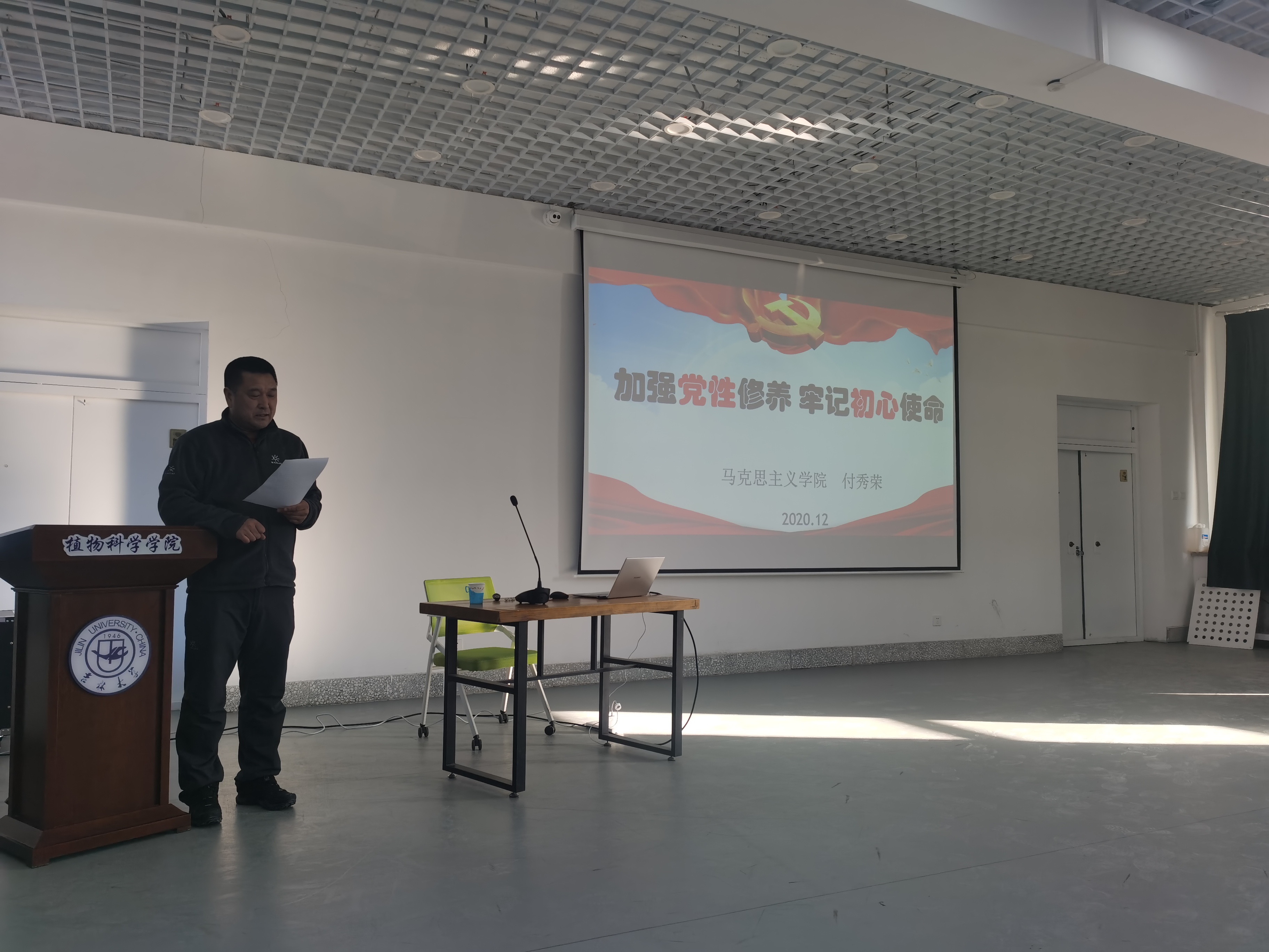 2020年12月4日下午,bat365在线中国官网登录入口邀请到马克思主义学院付秀荣教授到院讲授《加强党性修养,牢记初心使命》专题党课,学院全体党员参加学习,党课由副院长韩俊友教授主持。