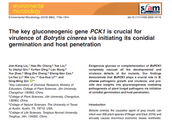 2018年4月24日,国际微生物领域著名学术期刊 《Environmental Microbiology》(中科院JCR分区:环境科学与生态学一区,5年IF:5.965)杂志在线发表bat365在线中国官网登录入口秦庆明教授课题组题为 “The key gluconeogenic gene PCK1 is crucial for virulence of Botrytis cinerea via initiating its conidial germination and host penetration” 的研究论文。值得一提的是,该研究是在秦庆明教授等指导下由本科生组成的大学生创新研究团队完成的。