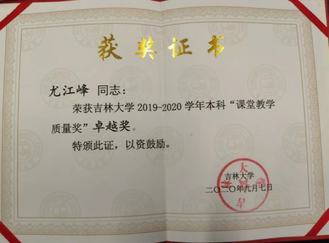 ▲尤江峰荣获bat365在线中国官网登录入口本科“课堂教学质量奖”卓越奖。