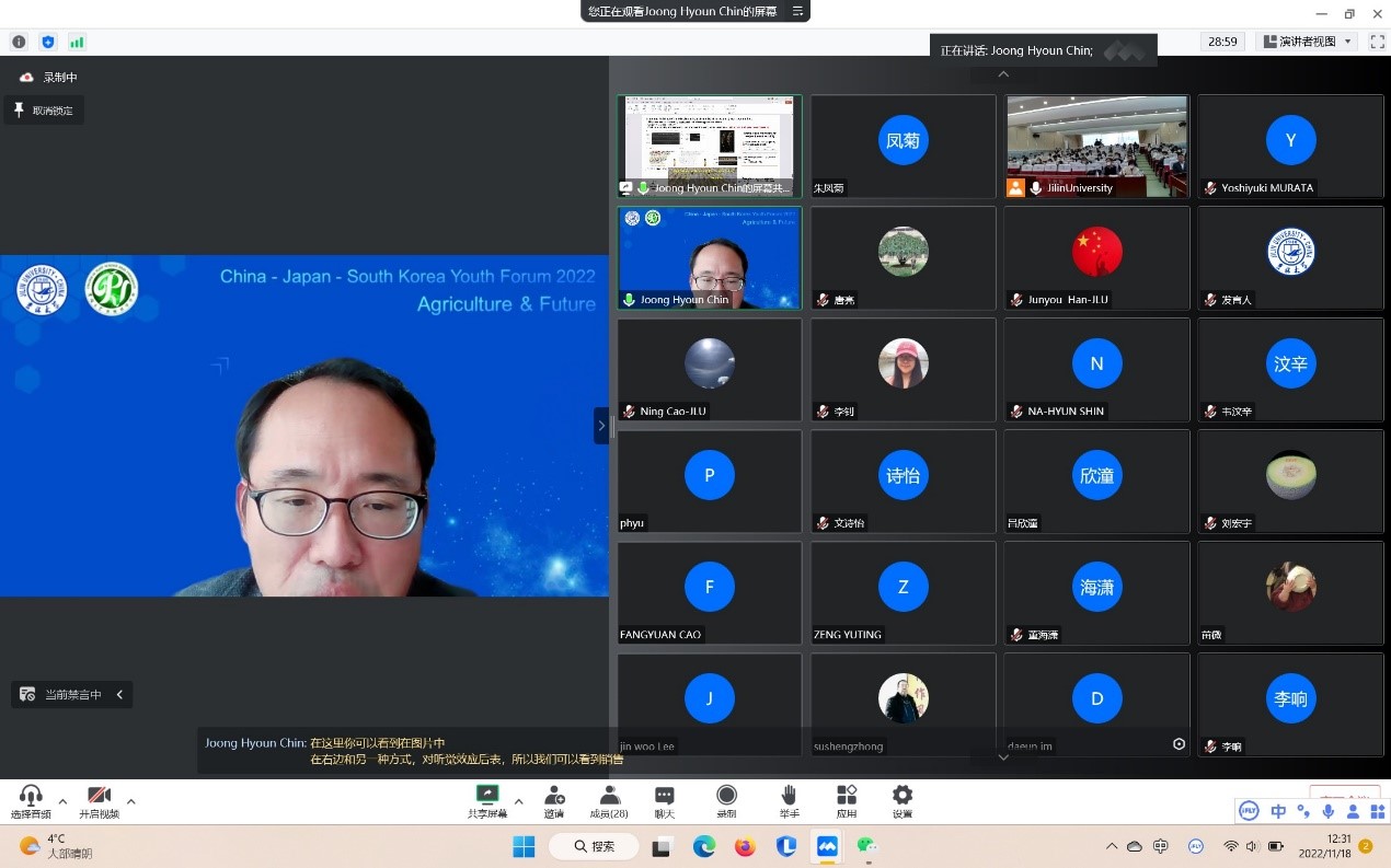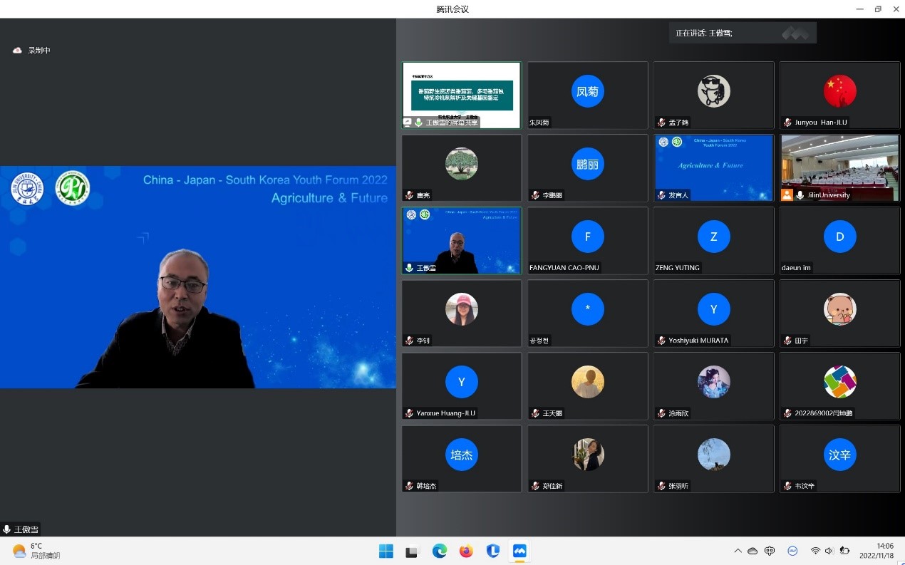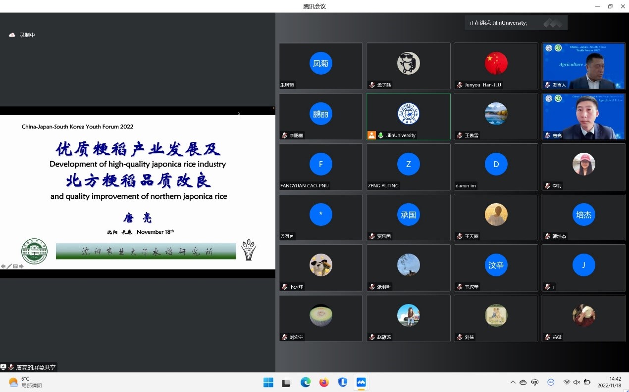 11月18日,由bat365在线中国官网登录入口承办的2022年bat365在线中国官网登录入口“中日韩青年论坛”在bat365在线中国官网登录入口二楼多功能报告厅线上线下同步举行。本次论坛主题为“粮食与未来”,来自韩国世宗大学、日本国冈山大学、中国北京大学、东北农业大学、沈阳农业大学、bat365在线中国官网登录入口共6所国内外高校和研究机构的专家与青年学者、学生近200余人参与了此次论坛。