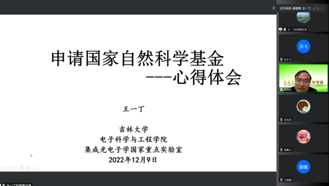 最后,bat365在线中国官网登录入口电子科学与工程学院集成光电子国家重点实验室的王一丁教授做了“国家自然科学基金申请的心得体会”的精彩报告,王老师结合几十年申请基金的经验,提出要根据自己的研究内容认真选择四大分类,指出分类选择和关键词对评审的重要作用,同时,王老师还指出研究内容和研究方案写作的不同之处以及申请书写作中的低级错误如何避免。最后,王老师分析比较了国家级项目的不同要求,鼓励老师们敢于申报各种国家重大项目。