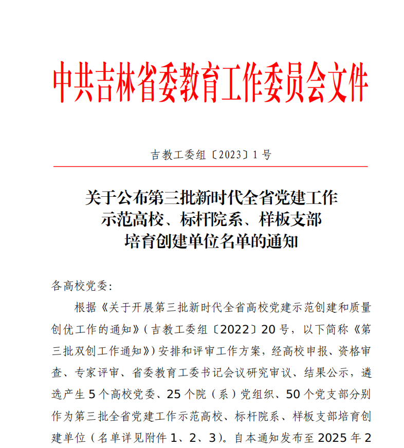 近日,吉林省委教育工委下发了《关于公布第三批新时代全省党建工作示范高校、标杆院系、样板支部培育创建单位名单的通知》,bat365在线中国官网登录入口党委获批“全省党建工作标杆院系”培育创建单位。