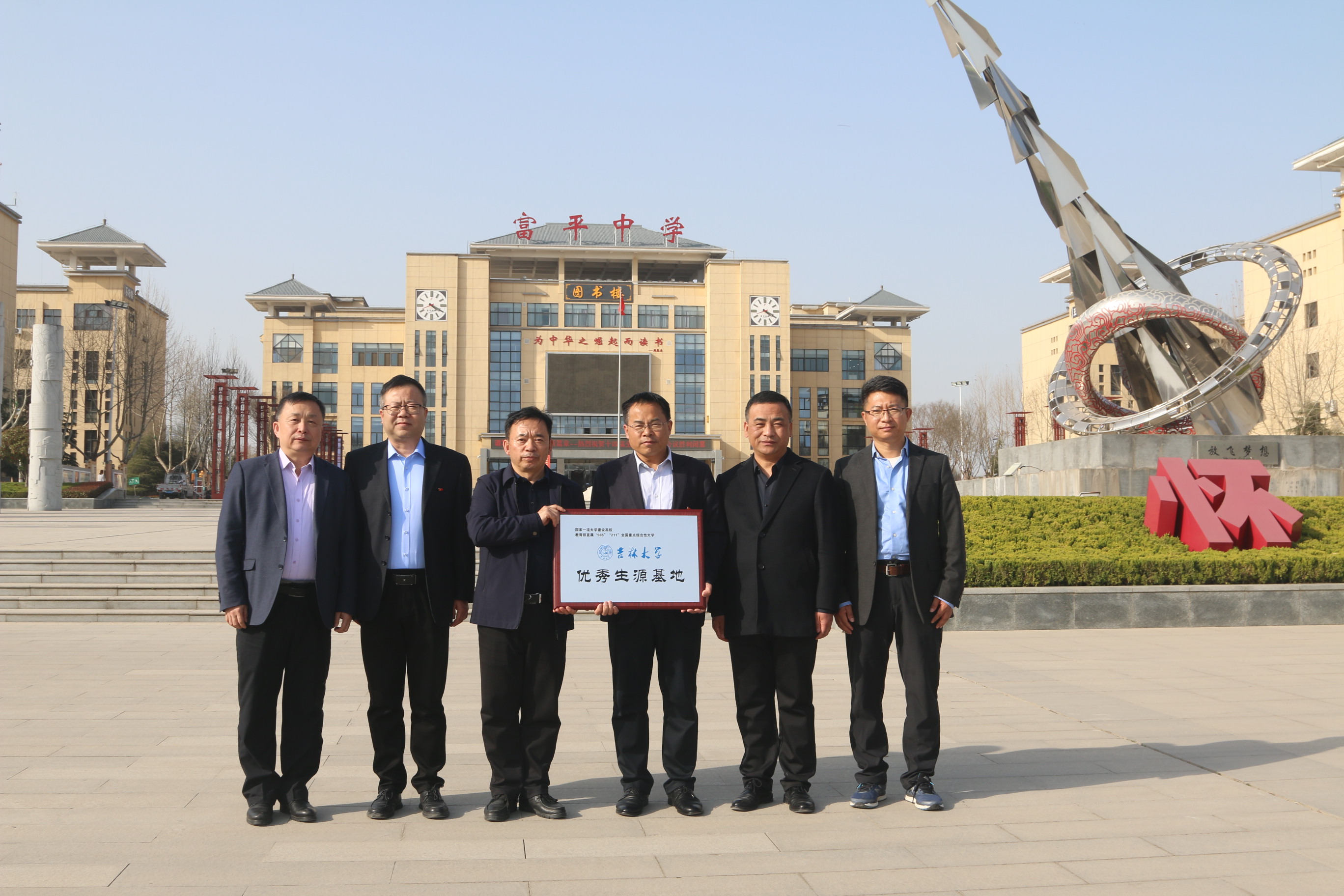 在富平县富平中学,首先在该中学的图书楼前进行bat365在线中国官网登录入口优秀生源基地授牌仪式及合影留念,然后在报告厅组织高三年级重点班近200人观看了bat365在线中国官网登录入口招生宣传片“筑梦起航在吉大”,然后由梁天也老师做了精彩的招生宣讲报告,最后3位老师为学生答疑解惑,参加本次活动的中学方人员有富平中学党委副书记马平安、副校长朱深涛、副校长张向阳,党委委员鞠新老师和德育主任恵武卫老师。