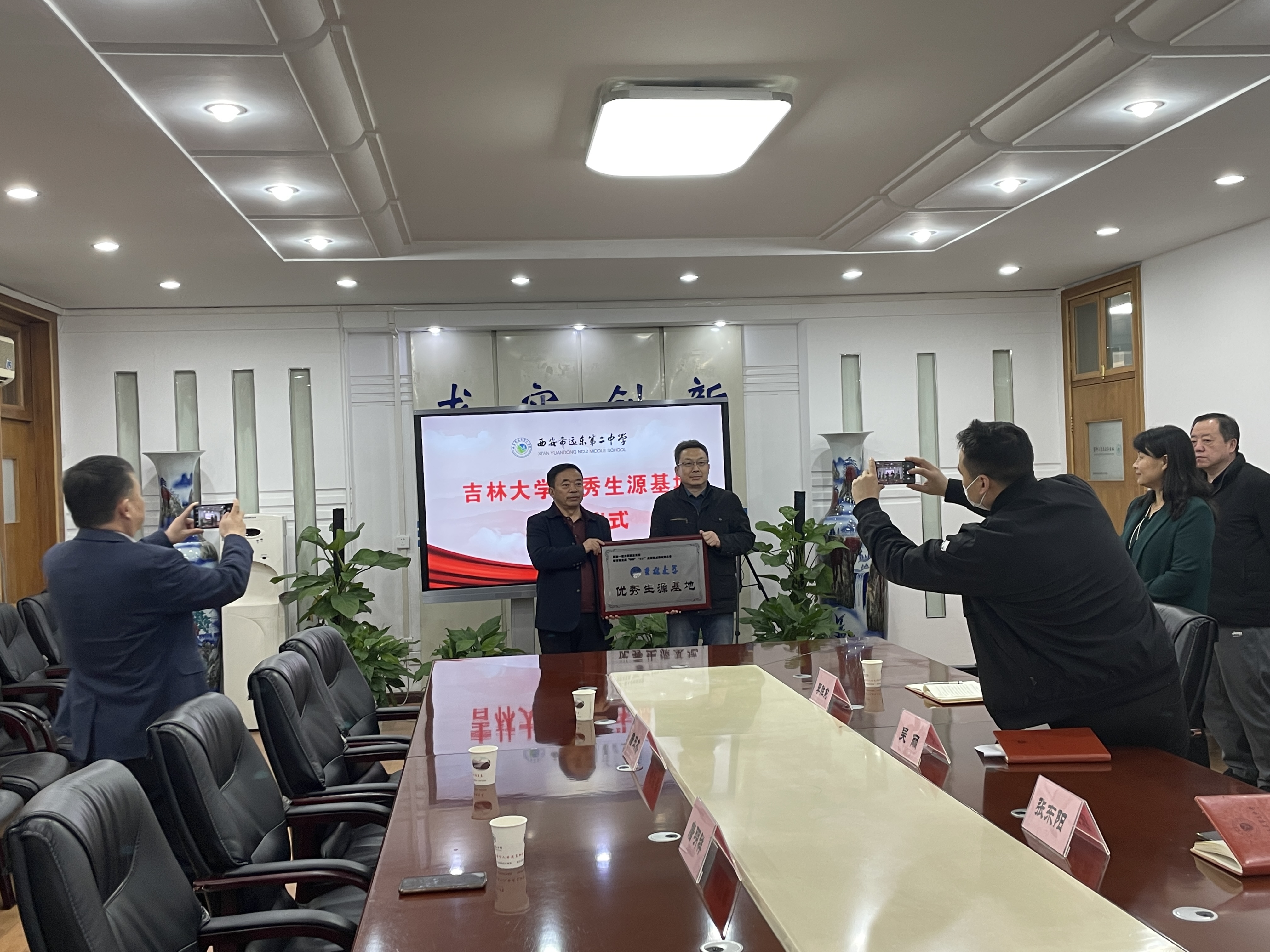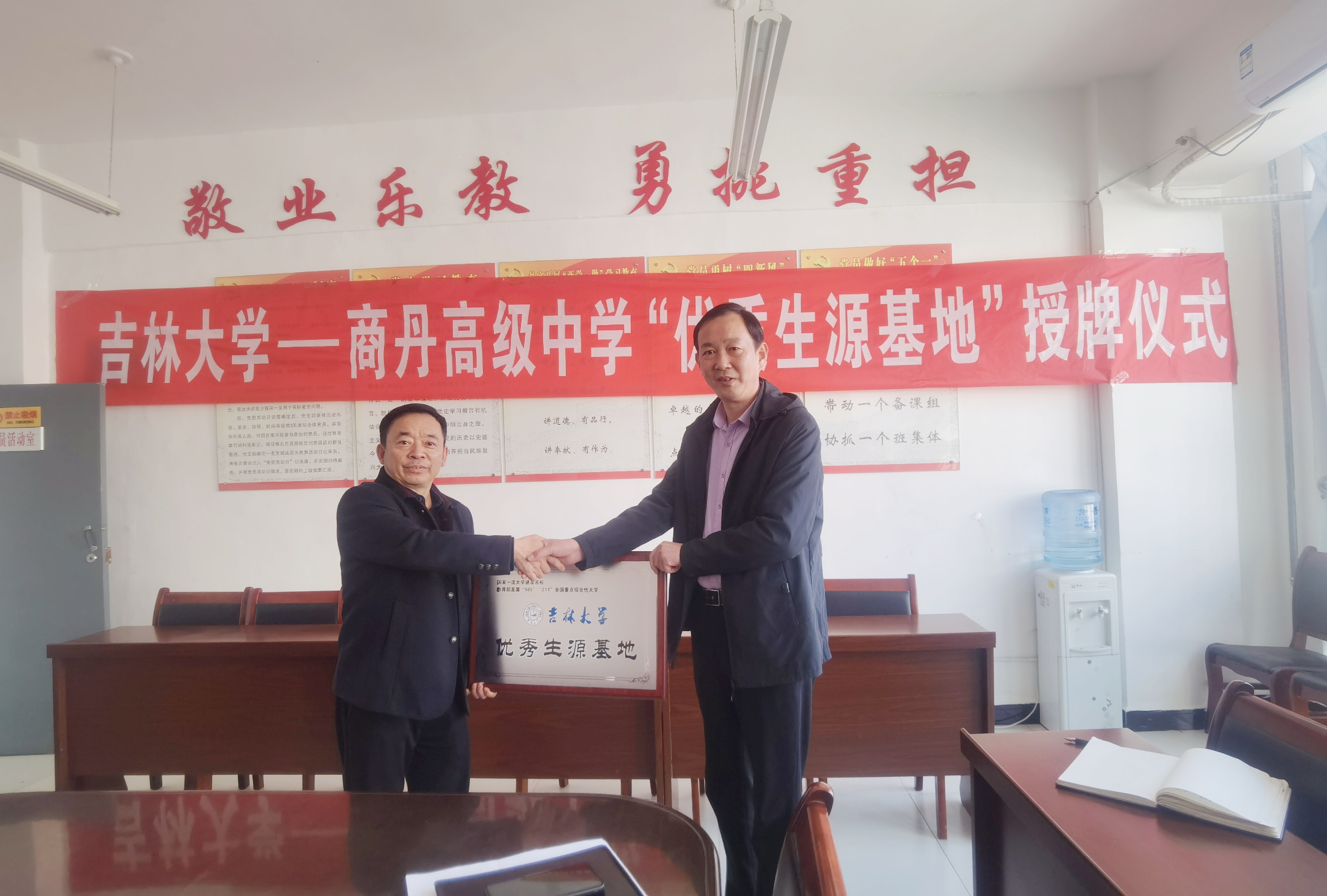 在商洛市商丹高级中学,组织高二学生收看bat365在线中国官网登录入口招生宣传片之后,任增元老师做了题为“筑梦起航在吉大”精彩报告,会场多次响起热烈的掌声,然后在该中学的会议室,校方领导陈建斌校长、王求亮副校长、李书斌副校长、张敏婷副书记和3位老师进行了深入广泛的交流,最后唐明祥老师为陈建斌校长授予“bat365在线中国官网登录入口优秀生源基地”牌匾。
