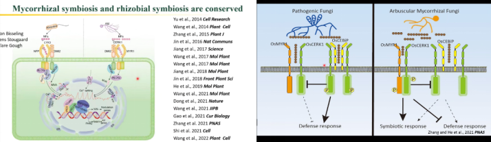 植物-微生物早期的信号互作研究中,王老师团队建立了植物区分共生菌和病原菌的基本概念。研究发现病原菌几丁质与CEBiP结合,促进其与CERK1形成复合体,激活了植物的抗病反应。而丛枝菌根真菌的短链几丁质直接结合MYR1,促进其与CERK1形成共生受体复合物,进而激活植物的共生反应,并抑制了病原受体复合物的形成,使其保持一个合适的植物免疫水平。这一机制被王老师称为是“单刀双掷模型”。CERK1在植物识别共生菌和病原菌的过程中至关重要,无病原菌时CIE1使得CERK1激酶活性降低,抑制植物自免疫。有病原菌时CERK1激活,磷酸化CIE1,CREK1活性进一步释放,产生植物免疫。这一现象类似于“刹车作用”。