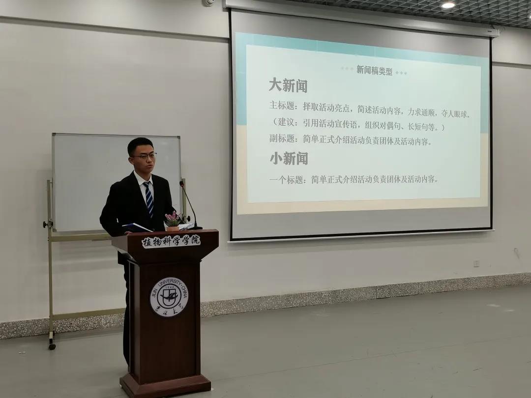 新闻部任书乐同学从新闻要素、叙述详略、人称敬语等方面做出了新闻稿的标准格式讲解,并且针对不同类型的活动强调了所写新闻稿的侧重点,在标题、正文以及各词句斟酌上都深入探讨。他以bat365在线中国官网登录入口2020年迎新工作新闻稿为例讲解了新闻稿的撰写格式及注意事项,条理清晰,使同学们豁然开朗。
