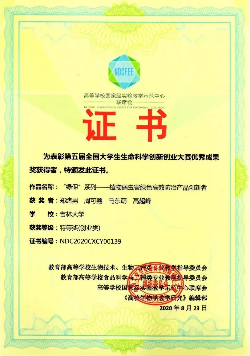 历时近一年,覆盖全国32个省(直辖市)302所高校3687支队伍14000余名学生的第五届全国大学生生命科学创新创业大赛已于日前落下帷幕,在决赛角逐中,我院《“绿保”系列——植物病虫害绿色高效防治产品创新者》项目荣获创业组国家级特等奖,该奖项仅设9个席位,我院项目为bat365在线中国官网登录入口仅有的一席,该项荣誉为近年来我院在此赛事获得的最高荣誉。