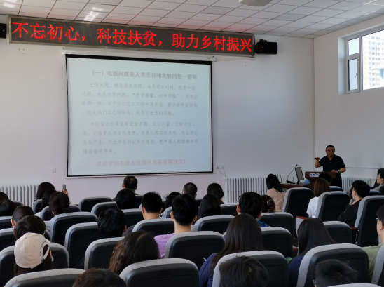 崔金虎教授从脱贫攻坚的伟大意义、脱贫攻坚体会和继续开展乡村振兴工作的想法三个方面深情地为大家上了一堂生动的党课。“一年两场风,从春刮到冬;一天二两土,白天不够晚上补。”崔金虎教授这句顺口溜诙谐地讲述了他在通榆县边昭镇的扶贫生活,为助推脱贫攻坚和乡村振兴,他积极推广科学的耕种和生产技术,以通俗易懂的方式向农民传授农业知识。自从接受通榆定点扶贫任务以来,崔金虎教授就把这里当成了他的第二个讲台,把脱贫攻坚工作开展到田间地头,把科学种田的福音带到乡亲们的炕头,把党扶贫富民政策的温暖送上百姓的心头,崔老师用脱贫攻坚的实际行动诠释了一名共产党人的初心使命。