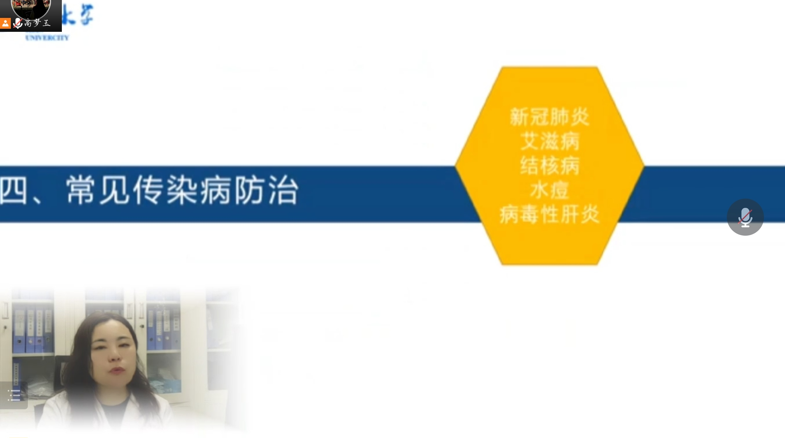 讲座过程中,阙宁老师详细介绍了校医院概况、学生医疗证的发放与使用、医院转诊与报销制度,让同学们充分了解了学校就医、医保报销、传染病预防等方面的相关信息。随后讲述有关大学健康教育课、应急救护培训等课程内容,让同学充分意识到健康教育的重要性。讲座的最后阙宁老师以简洁易懂的语言讲述有关新冠肺炎、艾滋病、结核病、水痘、病毒性肝炎等常见传染病的防治方法,加强有关防范传染病的卫生意识。