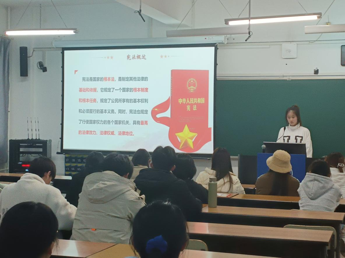 各团支部组织开展了宪法晨读、观看第九届国家宪法日教育系统“宪法晨读”直播、宪法歌曲学习传唱等形式多样的学习活动,带领学院学生深入学习贯彻习近平法治思想和习近平总书记关于宪法的重要论述,并举办宪法知识问答,以普法为主要目的,将宪法知识学习与现场竞赛相结合,进一步鼓励同学们学习宪法知识、培养法治思维。鼓励学院学生学习法治知识,增强法治意识,营造 “学法、知法、守法、护法”校园法治文化,将宪法精神进一步融入今后的学习与生活中。同时,对领学宪法宣传周的总体要求进行阐述,表明我们要以习近平新时代中国特色社会主义思想为指导,深入学习贯彻党的二十大精神,切实提高政治站位,增强“四个意识”,坚定“四个自信”,做到“两个维护”,确保宪法宣传的正确政治方向和舆论导向。要突出主题,深入学习宣传习近平法治思想,引导全社会坚定不移走中国特色社会主义法治道路。