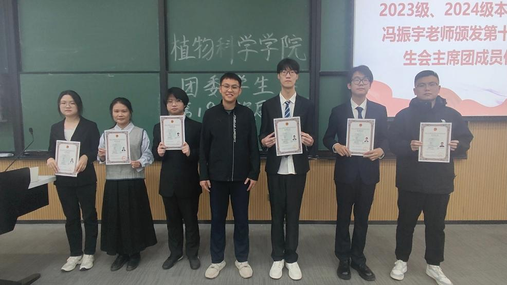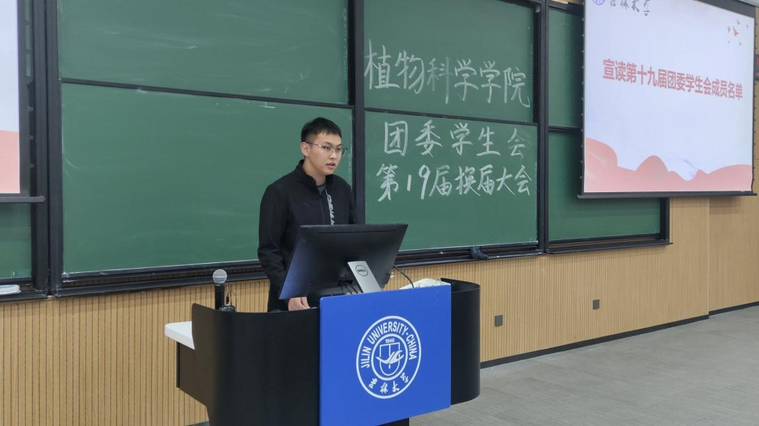 本科生辅导员冯振宇为第十八届学生会主席团成员代表颁发聘书并宣读第十九届学生会成员名单。